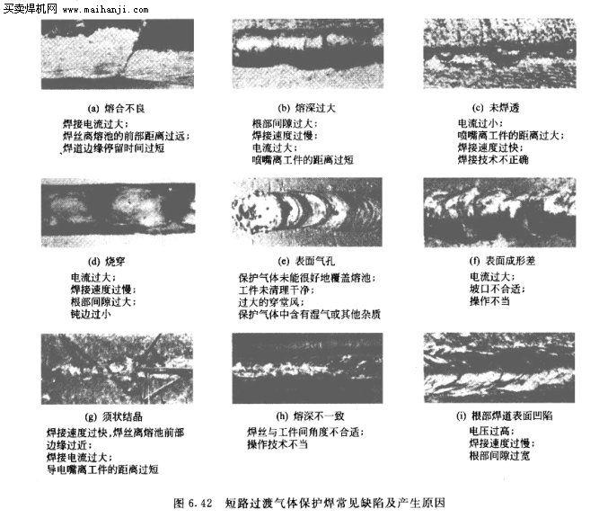 實際焊接過程中,導致焊縫質量下降的常見原因有;①破壞氣體保護效果的因素,例如側向風,如果焊接工作區有側向風,則保護氣體被 吹走,空氣進入電弧及熔池,焊縫質量會顯著降低。焊接過程中,有經驗的焊工是能夠觀察到這種保護不良現象的。保護不良時,熔池表面看上去變臟,且電弧不穩定。②保護氣體不純,例如保護氣體中含有水蒸氣、油或其他雜質等。③焊絲表面有油污、水分或其他雜質。④工件表面有油污、水分或其他雜質,圖6.42示出了熔化極氣體保護焊常見焊縫缺陷及原因。