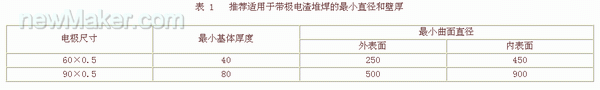 1)由于帶極電渣堆焊熱輸入較高,故一般用于堆焊50~200mm的厚壁工件,推薦適用的工件最小直徑和壁厚如表1所示。