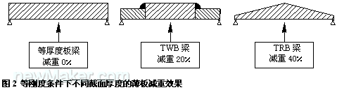 TWB和TRB 的應用都是為了達到汽車輕量化的目的。基于工程力學中薄壁梁承載性能的基本理論,若由等厚度板、TWB及TRB三種板材制成的結構件具有同樣的剛度,則其減重效果如圖2所示。