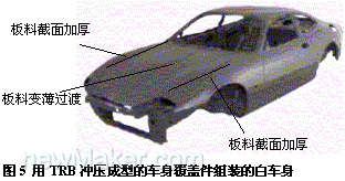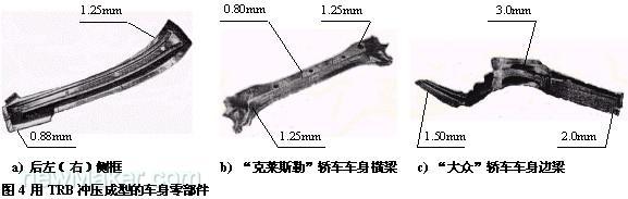 TRB連續變化的截面提供了有利于后續成型加工的可能性。比如,事先運用有限元分析或數字模擬技術判斷車身覆蓋件在沖壓過程中可能出現拉裂或材料流動性較大的部位,那幺,在車身設計階段就可以為某一部件的某個部位預先分配較大的板料厚度,從而有效地避免廢品的發生。