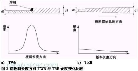TWB可以通過激光焊接工藝進行任意拼接,具有很大的靈活性。但由于它用不同厚度板材的對接或搭接,拼接處板料厚度有突變;此外焊縫及其附近會產生局部硬化,需要一道熱處理工藝來消除硬化效應,從而加大了工藝復雜程度。TRB則是靠柔性軋制工藝在不同厚度的板料之間形成一個連續的、緩變的過渡區,不存在TWB的焊縫問題。但它的不足之處是受軋制工藝和軋機設備的限制,其厚度變化只能發生在板料的初始軋制方向上;此外,現有的軋制工藝還無法把不同金屬材料的板料“軋制”在一塊整板上,即在靈活性上不如TWB。