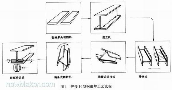 隨著國內(nèi)鋼結構行業(yè)的不斷發(fā)展,H型鋼在許多鋼結構廠房、機場、高層建筑及橋梁中得到普遍的應用。H型鋼原本由鋼廠軋制而成,但因軋制型鋼的規(guī)格有限且價格比普通優(yōu)質鋼板高得多,使焊接H型鋼逐漸成為建筑鋼結構設計和生產(chǎn)中首選的結構型材,焊接H型鋼的需求量逐年大幅度增加。采用手工加機械組裝焊接生產(chǎn)焊接H型鋼的方式由于生產(chǎn)效率低,而遠遠不能滿足建筑鋼結構高速發(fā)展的需要。因此,為提高焊接H型鋼的生產(chǎn)效率,以自動生產(chǎn)線的方式組織生產(chǎn)是必然的發(fā)展趨勢。