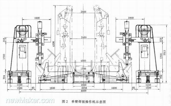 單臂焊接操作機由臺車體、立柱、橫梁、滑板行走機構、電機驅動系統(tǒng)、焊槍跟蹤機構、焊劑輸送回收系統(tǒng)、焊接機頭、焊接電源和電氣控制系統(tǒng)等組成,其結構外形圖見圖2。